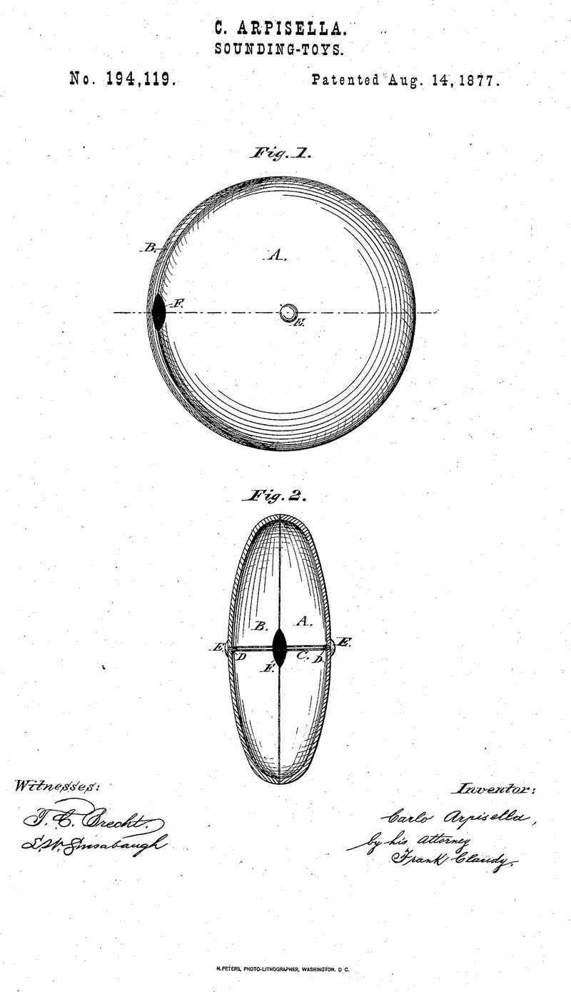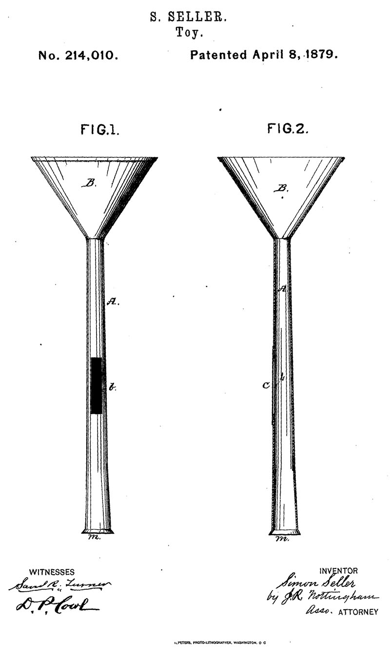 The First Kazoo In the text of the patent he refers to it as "This instrument or toy, to which I propose to give the name 'kazoo' ". So far I have found nothing that indicates why he chose the name kazoo. This first kazoo was not the familiar 'submarine' shape. |