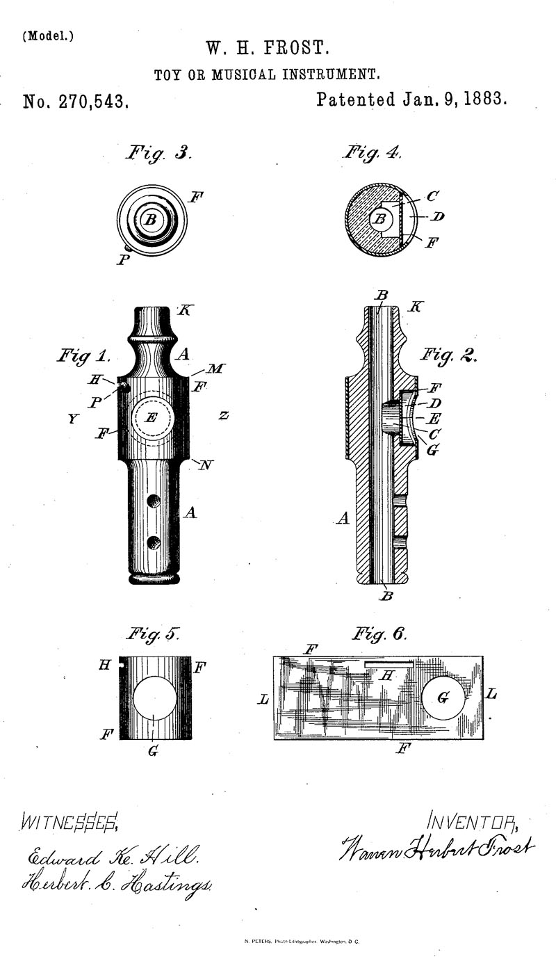 The second of Mr. Frost's patents was an improvement on the first kazoo, but was not referred to as a kazoo, although it is basically the same shape. This one was assigned to George D. Smith (more about him later). |