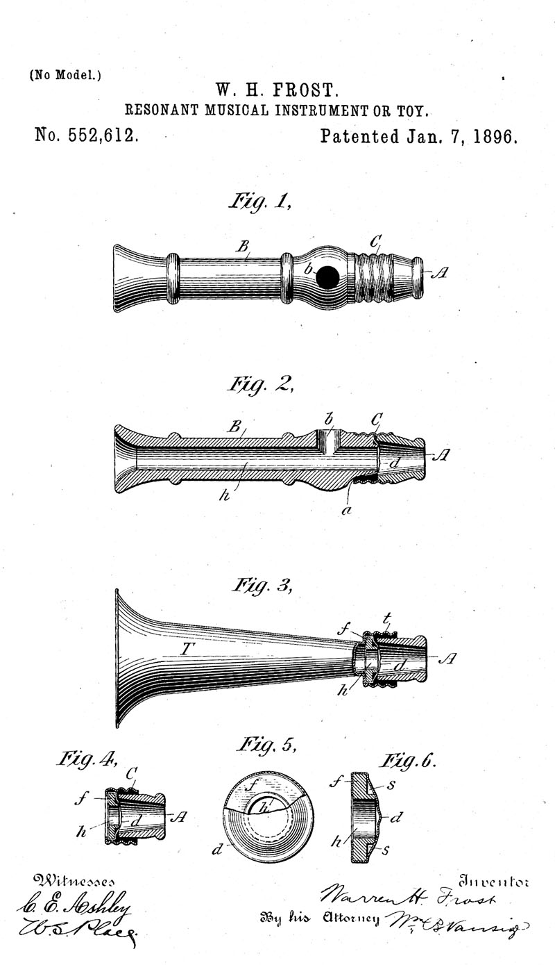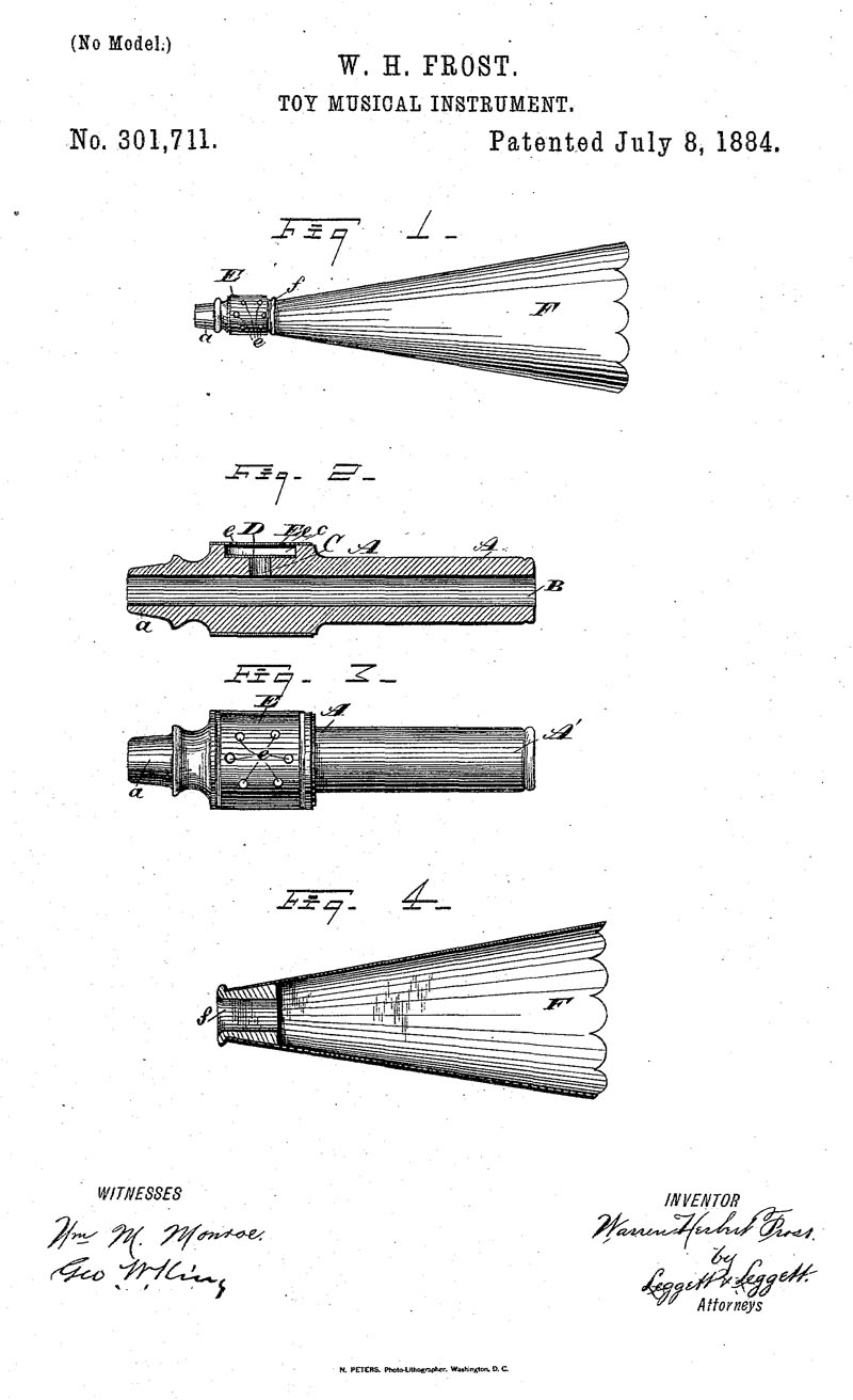 Mr. Frost's third patent is for the instrument sold as the “Zobo” or “Zobo Horn”. Bands of boys or adults equipped with Zobos where popular in the late 1890s and early 1900s. The main difference between this and the first two being the diaphragm is perpendicular to the body of the instrument and the flow of sound, and the membrane is mounted on a rigid removable ring.The main difference between the first two and this is the diaphragm is perpendicular to the body of the instrument and the flow of sound, rather than parallel and the membrane is mounted on a rigid removable ring. |